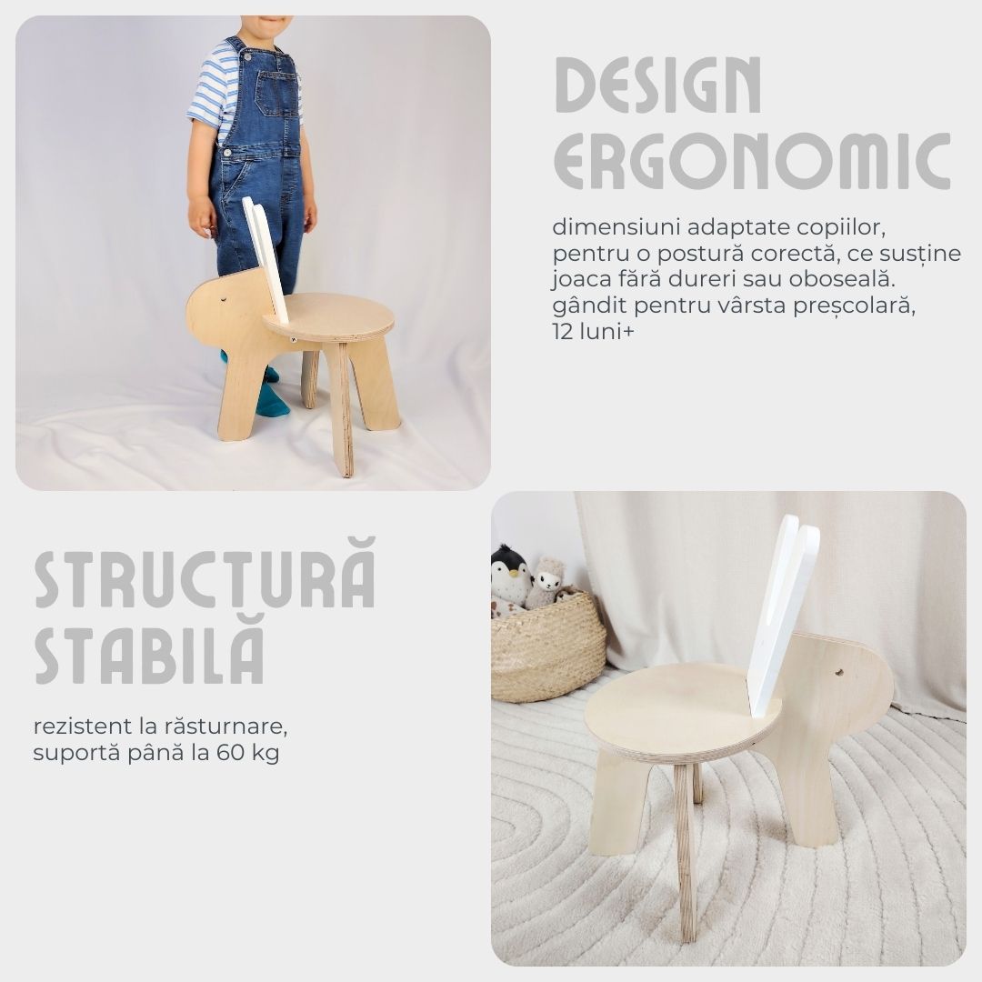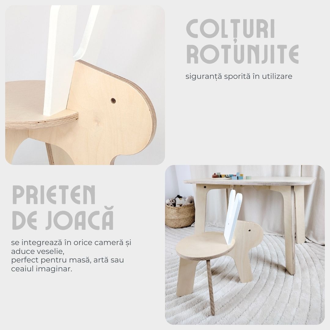 Realizat din lemn natural multistrat, finisat cu grijă și gândit special pentru cei mici, Bunny este ideal pentru activități zilnice precum desen, citit sau jocuri creative.